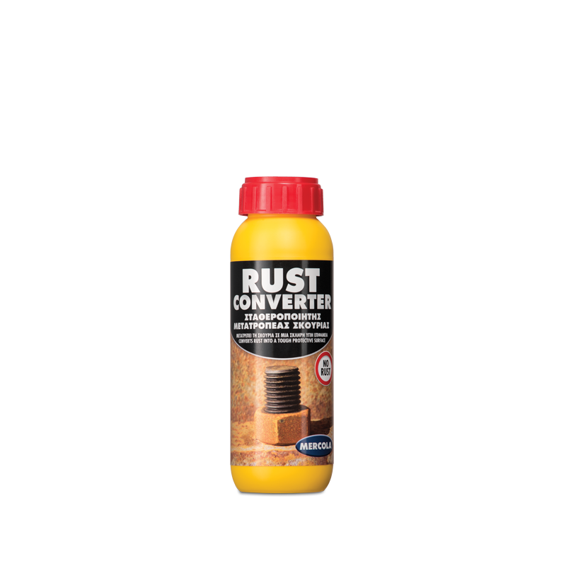 Το RUST CONVERTER είναι ένα καινοτομικό προϊόν που μετατρέπει τη σκουριά (νέα και παλιά) σε μία προστατευτική μαύρη πολυμερική επικάλυψη. Έχει εξαιρετική πρόσφυση σε μεταλλικές επιφάνειες και εμποδίζει την περαιτέρω διάβρωση. Σφραγίζει την επιφάνεια του μετάλλου από την υγρασία και το οξυγόνο παρατείνοντας το χρόνο προστασίας της.